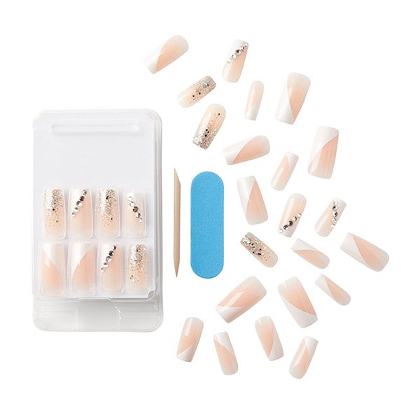 O kit contém 30 unhas postiças, cola de gel rosa (2 g), mini lixa e palito de manicure.