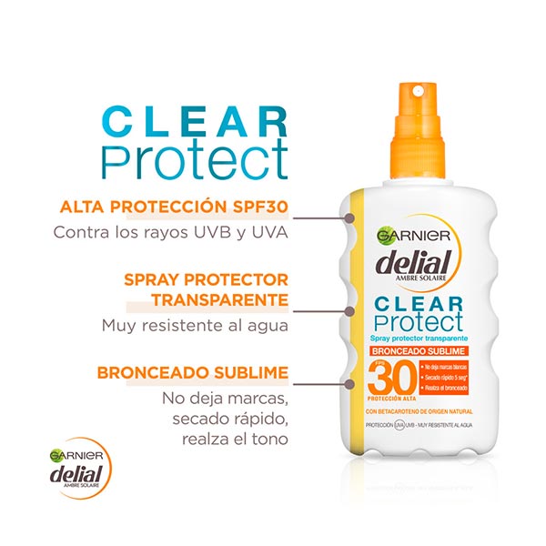 Delial Clear Protect Spray IP30 Ideal Bronze é um spray protetor solar transparente que realça o bronzeado.
