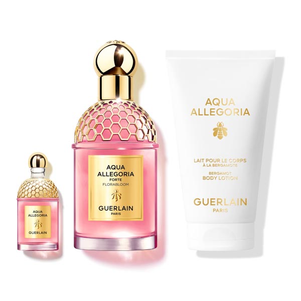 O estojo de presente Eau De Parfum Aqua Allegoria Forte Florabloom da Guerlain inclui o perfume Aqua Allegoria Forte Florabloom em um formato de 75 ml e uma miniatura de 7,5 ml. O perfume apresenta um buquê floral multicolorido, com notas de sândalo e musgo. Também está incluído um leite corporal de bergamota de 75 ml, que reflete a vitalidade das bergamotas da Calábria, Itália. A apresentação do estojo é exclusiva, com um design inspirado no Art Nouveau, criado por Mélissandre Vidal. A Guerlain utiliza um design de economia circular, com uma nécessaire reutilizável e materiais recicláveis no estojo e na capa, além de um tubo que contém pelo menos 26% de material reciclado. O produto é unissex e é classificado como estojo de presente.