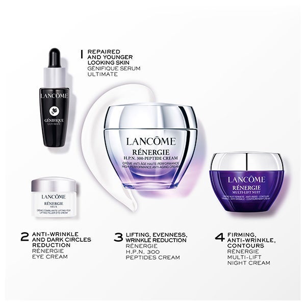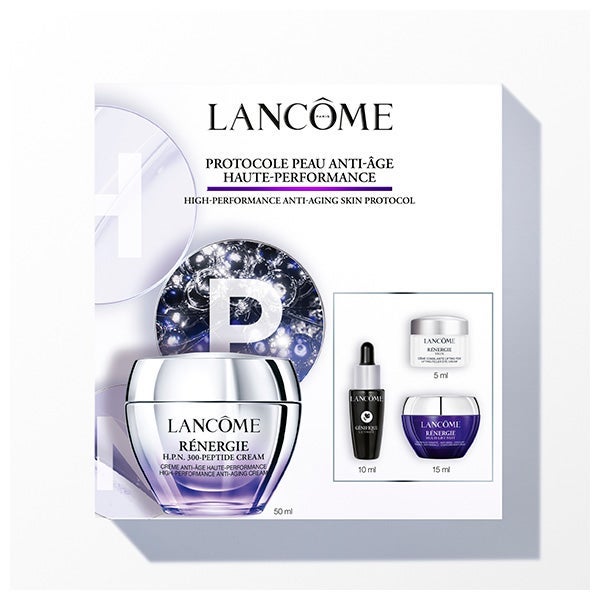 • Crema Rénergie H.P.N. 300-Peptide 50 ml: Contiene una mezcla exclusiva de ácido hialurónico, 300 tipos de péptidos y niacinamida, ofreciendo un alto rendimiento antiedad. Resultados excepcionales en múltiples parámetros clínicos: +27% de lifting**, -21% de arrugas**, -22% de manchas oscuras**.