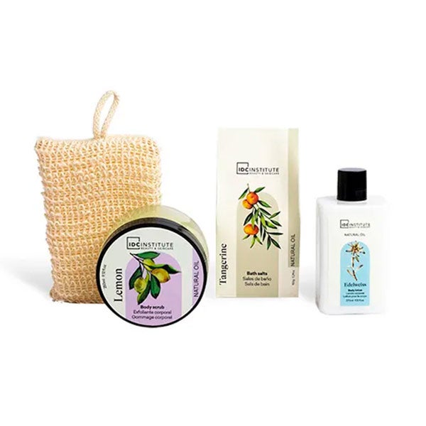 Esta cesta de vime contém uma loção corporal, um esfoliante corporal, sais de banho e uma esponja de sisal em um suave aroma frutal.