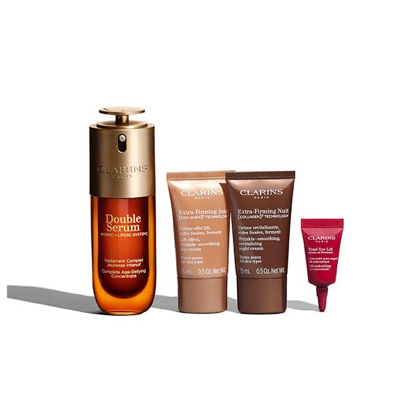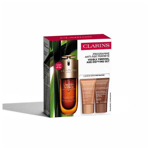 El cofre antiarrugas y firmeza para las mujeres que buscan una piel visiblemente más joven y lisa, reafirmada y con efecto lifting. En primer lugar, la mirada con Double Serum Eye, que ayuda a reducir las arrugas y patas de gallo y reafirmar la delicada piel del contorno de los ojos. A continuación, el mítico Double Serum formulado con 27 extractos de plantas combate los signos de la edad. La crema antiedad Extra-Firming Energy con extracto de flor canguro reafirmante contribuye a revelar un rostro de apariencia más joven a lo largo de las aplicaciones, con un favorecedor efecto buena cara.