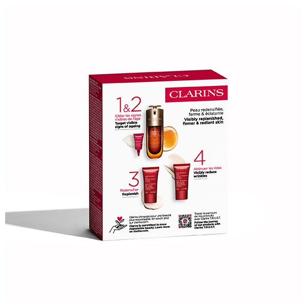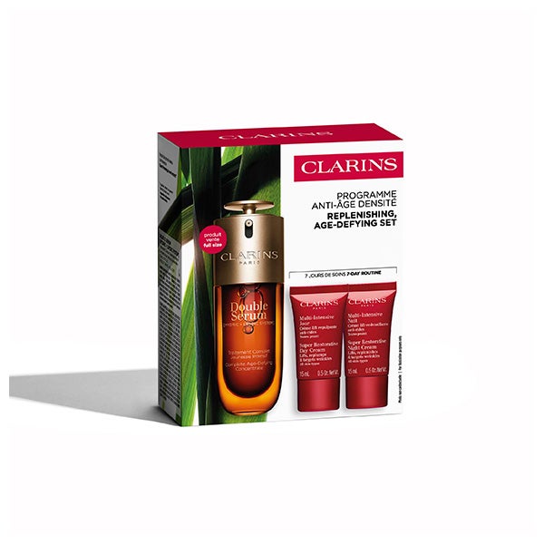El cofre de tratamientos redensificantes para las pieles debilitadas por los cambios hormonales de la edad: el mítico Double Serum con 27 extractos de plantas y un dúo de cremas antiedad de día y noche redensificantes y alisadoras formuladas con extracto de harungana. Día tras día, la piel del rostro está más lisa, redensificada, los contornos se remodelan y las arrugas se atenúan visiblemente. Para la mirada, Double Serum Eye ayuda a reducir las arrugas y patas de gallo y reafirmar la delicada piel del contorno de los ojos para una apariencia más joven y revitalizada.