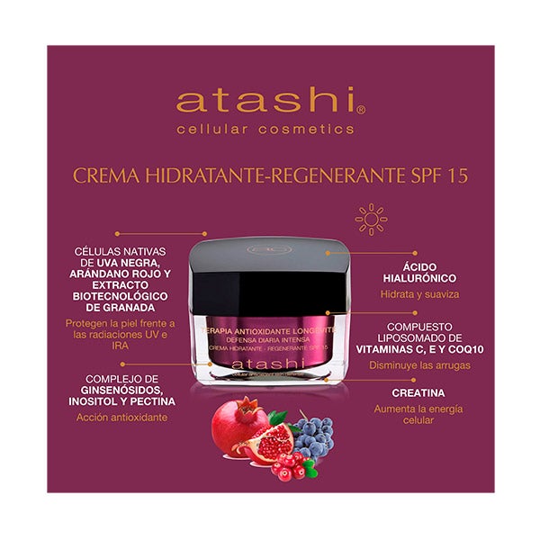 Atashi Antioxidante Creme Hidratante Regenerante SPF15 50ml. Tratamento de dia, creme hidratante SPF15, projetado para proteger a pele contra os efeitos nocivos das radiações e da poluição diária.