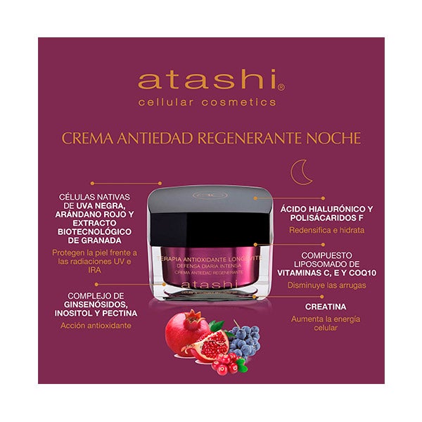 Atashi Creme Antioxidante Antienvelhecimento Regenerador facial noturno revitalizante que diminui as rugas, freia e repara o envelhecimento induzido pela radiação solar UV e pela poluição. A pele rejuvenesce instantaneamente e ilumina.