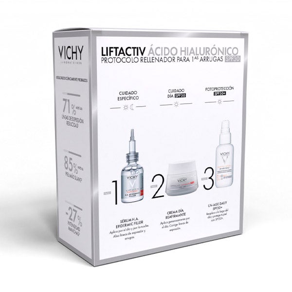 • Liftactiv H.A. SPF30 50 ml: um creme poderoso rico em ácido hialurônico, clinicamente comprovado para reduzir linhas de expressão e suavizar a pele do rosto.