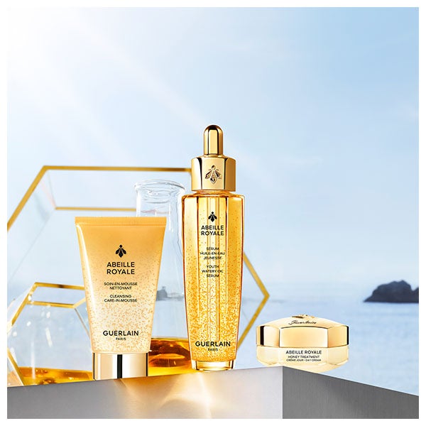 O Óleo Aquoso de Juventude Avançado e três tratamentos complementares reunidos em um cofre que oferece um ritual de juventude enriquecido com o poder reparador da juventude do mel.