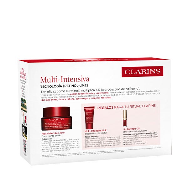 El Cofre Multi-Intensive de Clarins para pieles secas ofrece una respuesta experta a las necesidades de las pieles maduras que presentan pérdida de densidad, sequedad y falta de luminosidad. Incluye la Crema Multi-Intensive Día Pieles Secas, que redensifica, nutre intensamente y protege frente a los signos de envejecimiento, la Crema Multi-Intensive Noche 15ml, que regenera y fortalece la piel mientras duermes, y el Mini Lip Comfort Oil, que hidrata y embellece los labios. Formulado con extractos de plantas como el harungana bio, este cofre proporciona una acción antiedad global, nutrición intensa y tratamiento redensificante para una piel visiblemente más firme, confortable y luminosa.