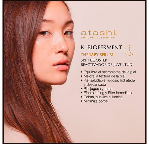 Atashi K-Bioferment Luxury Therapy Sérum facial es un pretratamiento enegético antiedad, revitalizante y multicorrector para pieles sin descanso y sometidas a estilos de vida agotadores, Prepara tu piel para potenciar los beneficios de tu tratamiento de noche, Basándose en la cosmética Koreana, fortalece la piel y su microbioma, y protege la epidermis del estrés epigenético gracias a su fórmula con Biofermentos y el Hongo Ganoderma.