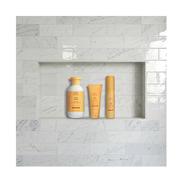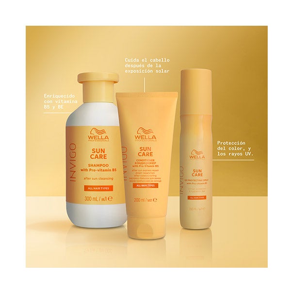 Wella Invigo Sun Champô 300ml: Champô com provitamina B5 e protetor solar que limpa suavemente, purificando o cabelo e a pele dos resíduos de sal e areia. Com tecnologia Sun-Blend. Proteção do cabelo contra o sol.