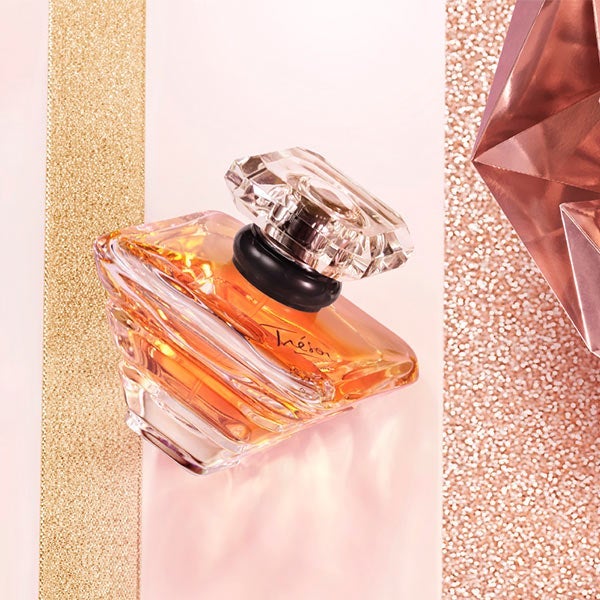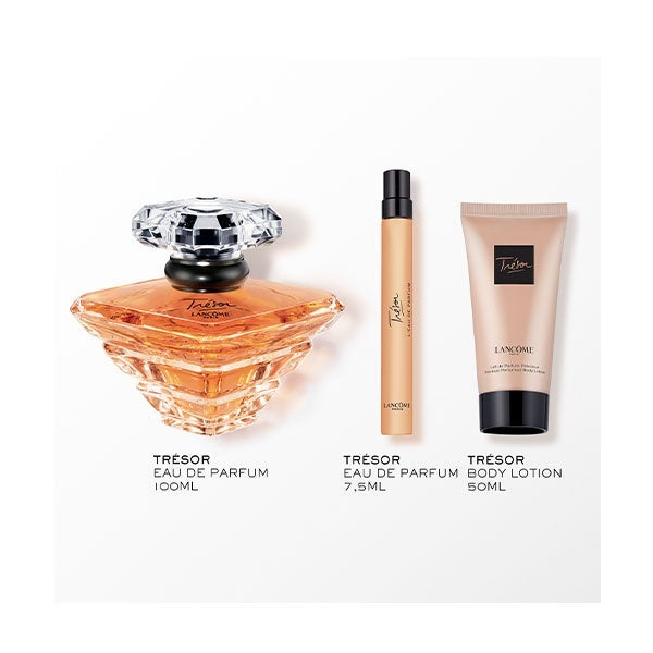 Trésor Eau de Parfum 100 ml e tamanho viagem 10 ml: o perfume feminino dos momentos preciosos do amor. Fruto da encarnação perfeita do amor absoluto em todas as suas facetas. Revela as notas florais, frutadas, sedosas e ambarinas de Trésor. A majestosa Rosa Otto entrelaçada com a doçura do pêssego e a profundidade do sândalo.
