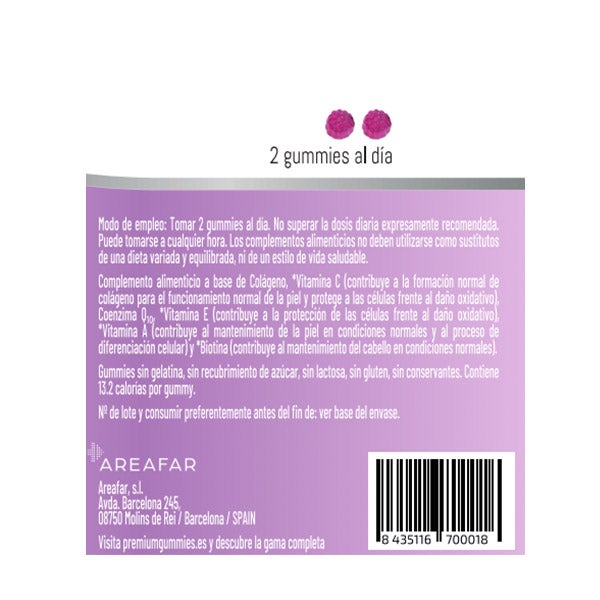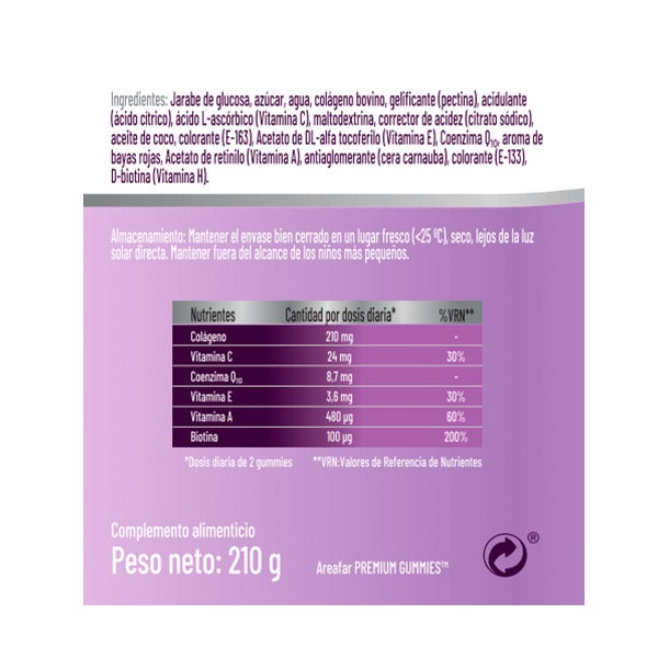 Jarabe de glucosa, azúcar, agua, colágeno bovino, gelificante (pectina), acidulante (ácido cítrico), ácido L-ascórbico (Vitamina C), maltodextrina, corrector de acidez (citrato sódico), aceite de coco, colorante (E-163), Acetato de DL-alfa tocoferilo (Vitamina E), Coenzima Q10, aroma de bayas rojas, Acetato de retinilo (Vitamina A), antiaglomerante (cera carnauba), colorante (E-133), D-biotina (Vitamina H).