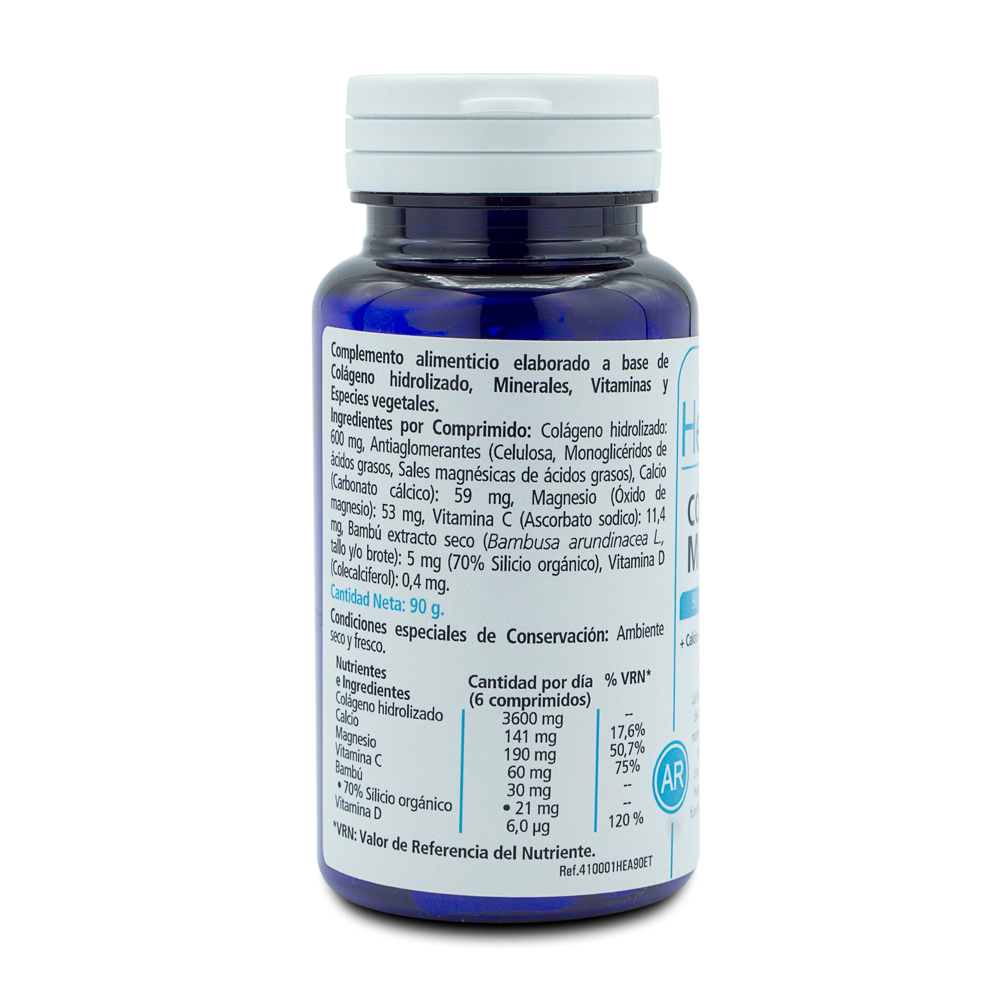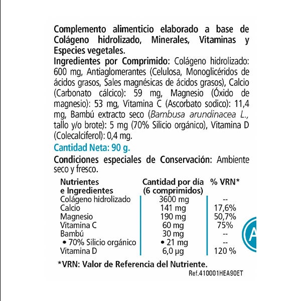 Ingredientes por Comprimido: Colágeno hidrolizado: 600 mg, Antiaglomerantes ( Celulosa, Monoglicéridos de Ácidos grasos, Sales magnésicas de Ácidos grasos), Calcio ( Carbonato calcio ): 59 mg, Magnesio ( Óxido de magnesio ): 53 mg, Vitamina C ( Ascorbato sódico ). 11,4 mg , Bambú extracto seco ( Bambusa arundinacea- L, tallo y/o brote ): 5 mg ( 70%silicio orgánico ), Vitamina D ( Colecalciferol ): 0,4 mg.