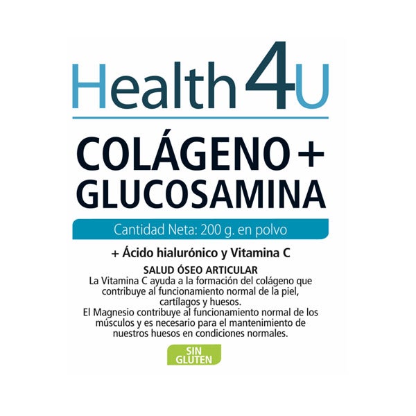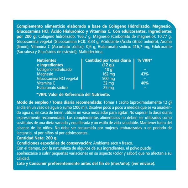 Ingredientes por 200 g:[intro]Colágeno hidrolizado: 166,7 g, Magnesio (Carbonato de magnesio): 10,77 g, Glucosamina vegetal (Glucosamina HCI): 8,33 g, Acidulante (Ácido cítrico anhidro), Aroma (limón), Vitamina C (Ascorbato sódico): 0,6 g, Hialuronato sódico: 416,7 mg, Edulcorante (Sucralosa y Glucósidos de esteviol), Maltodextrina.