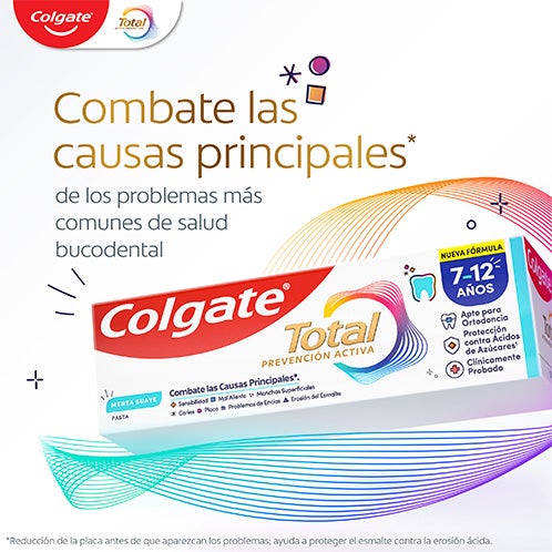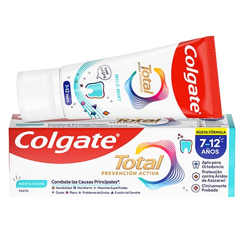 Colgate Total crianças 7-12 anos com sabor menta suave é uma pasta de dentes infantil, especialmente desenvolvida para crianças.