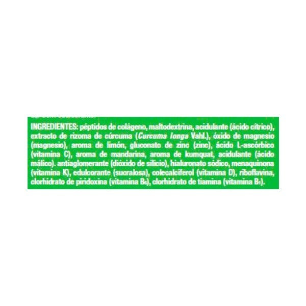 Péptidos de colágeno, maltodextrina, acidulante (ácido cítrico), extracto de rizoma de cúrcuma (Curcuma longa Vahl.), óxido de magnesio (magnesio), aroma de limón, gluconato de zinc (zinc), ácido L-ascórbico (vitamina C), aroma de mandarina, aroma de kumquat, acidulante (ácido málico), antiaglomerante (dióxido de silicio), hialuronato sódico, menaquinona (vitamina K), edulcorante (sucralosa), colecalciferol (vitamina D), riboflavina, clorhidrato de piridoxina (vitamina B6), clorhidrato de tiamina (vitamina B1).