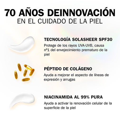 Fórmula exclusiva com péptidos de colágeno e vitamina B3.