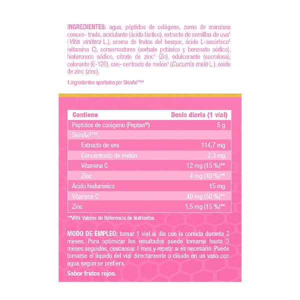 Agua, péptidos de colágeno, zumo de manzana concen- trado, acidulante (ácido láctico), extracto de semillas de uva1 (Vitis vinifera L.), aroma de frutos del bosque, ácido L-ascórbico1 (vitamina C), conservadores (sorbato potásico y benzoato sódico), hialuronato sódico, citrato de zinc1 (Zn), edulcorante (sucralosa), colorante (E-120), con- centrado de melón1 (Cucumis melo L.), óxido de zinc (zinc).