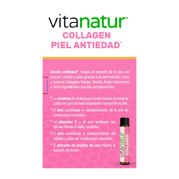 VITANATUR COLLAGEN PIEL* é um suplemento alimentar em frascos para beber que melhora a aparência da pele com benefícios adicionais para cabelo e unhas graças à sua formulação única à base de Colágeno Peptán, SkinAx, Ácido Hialurônico e outros ingredientes que os complementam: