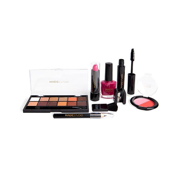 Realize sua maquiagem completa combinando os tons e produtos que mais gosta. Este conjunto de produtos super pigmentados tem tudo. Você não precisará usar mais nada! Contém 1 paleta de sombras de olhos (12 cores e aplicador), 1 lápis delineador de olhos, 1 esmalte de unhas vermelho, 1 máscara de cílios, 1 blush com pincel, 1 batom e 1 apontador.