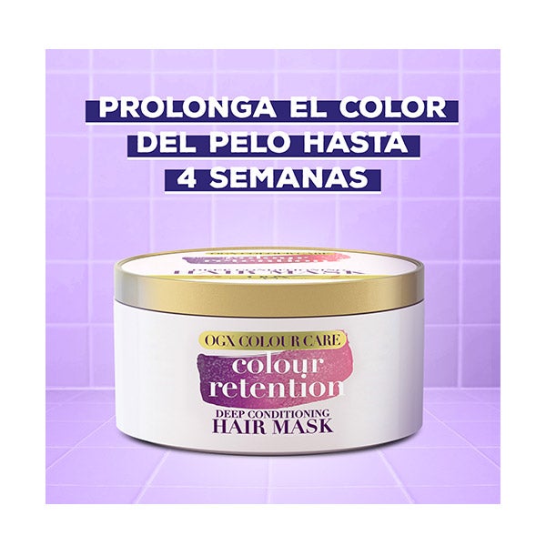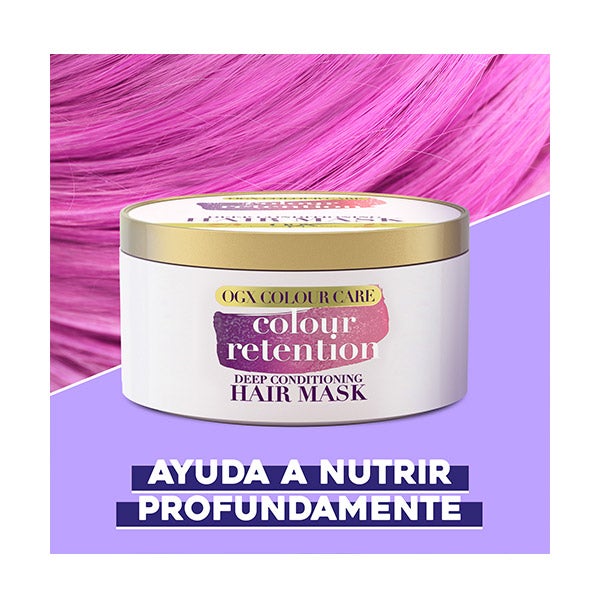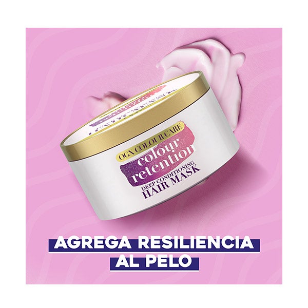 A OGX Retenção de Cor, Máscara Capilar Hidratante com Tecnologia Bond Plex foi projetada para ser uma máscara para cabelo profundamente condicionadora que ajuda a suavizar e fortalecer os fios danificados e prolonga a cor por até 4 semanas. Esta máscara para cabelo tingido ajuda a dar suavidade e uma cor brilhante que dura. A tecnologia Color Bond Plex foi criada para evitar o dano dos raios UVA e UVB.