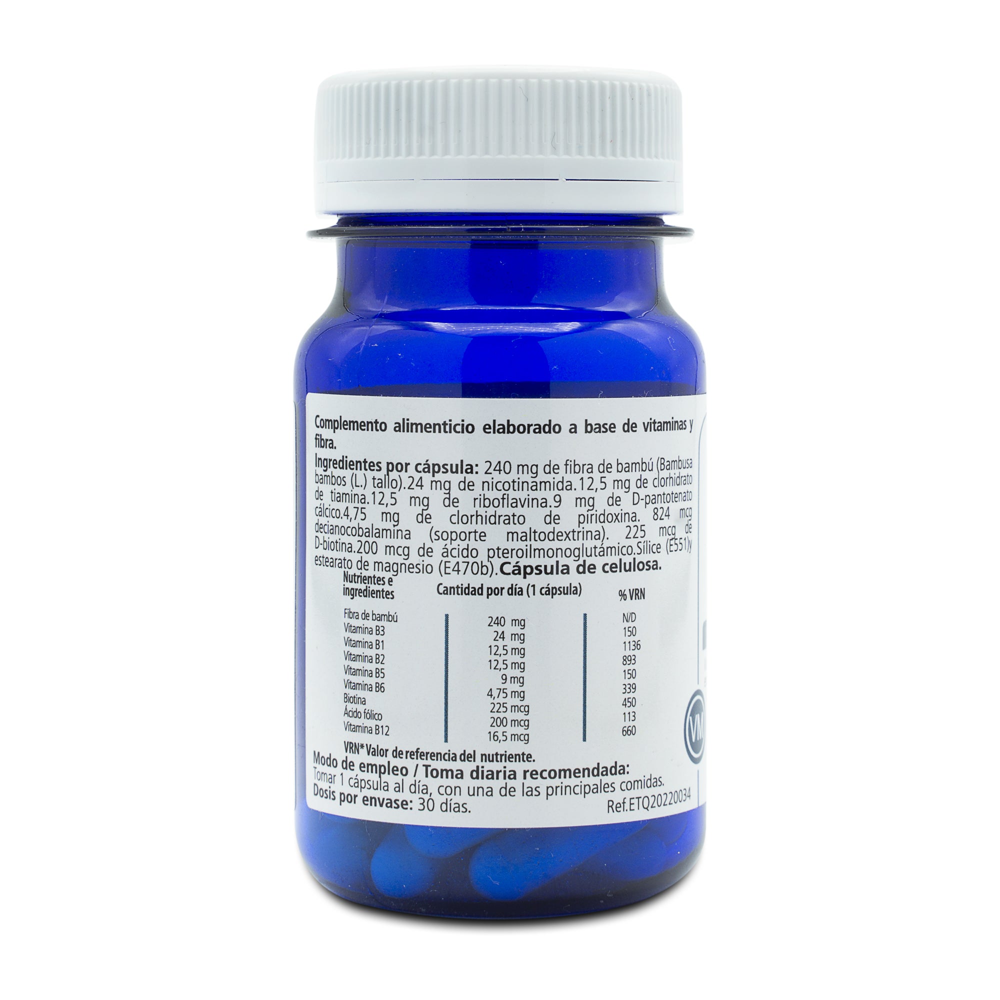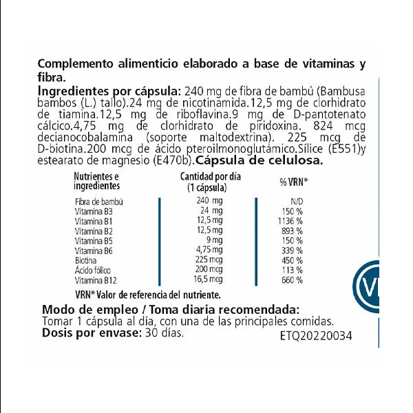 Ingredientes por cápsula: 240 mg de fibra de bambú (bambusas bambos (L) tallo). 24 mg de nicotianamina. 12,5 mg de clorhidrato de tiamina. 12,5 mg de riboflavina. 9 mg de D-pantotenato cálcico. 4,75 mg de clorhidrato de piridoxina. 824 mcg decianocobalamina (soporte maltodextrina). 225 mg de D-biotina 200 mg de Ácido pteroilmonoglutámico. Sílice (E551) y estearato de magnesio (E470b).