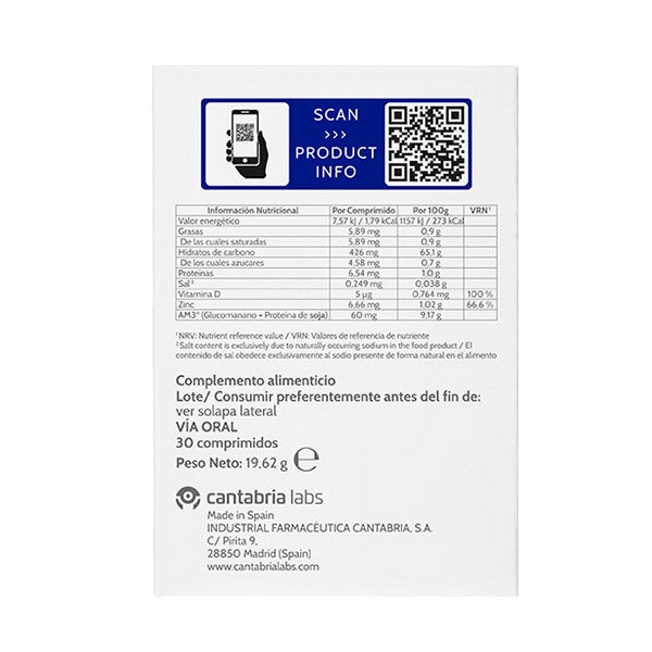 Suplemento alimentar com uma fórmula exclusiva à base de AM3® (alfa glucomanano fosforilado e proteína de soja), tecnologia patenteada pela Cantabria Labs, com vitamina D e Zinco, ingredientes que contribuem para o funcionamento normal do sistema imunológico.