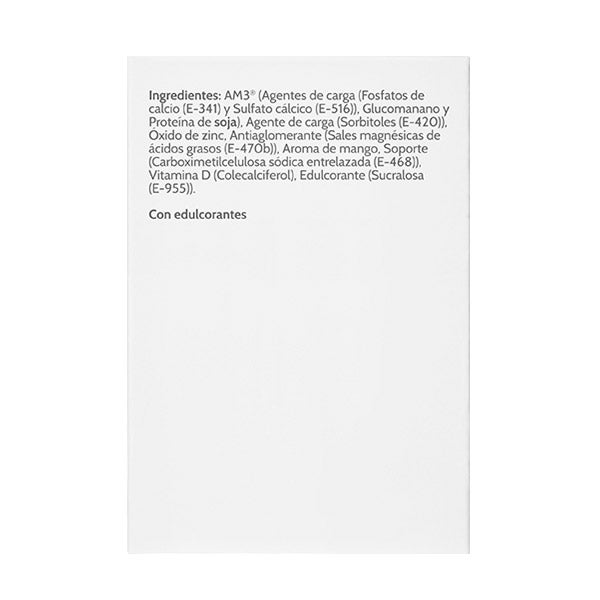 AM3 (Agentes de carga (Fosfatos de calcio (E-341) y sulfato calcico (E-516)), Glucomanano y Protéina de soja), Agente de carga (Sorbitoles (E-420)), Óxido de zinc, Antiaglomerante (Sales magnesicas de ácidos grasos (E-470 b)), Aroma de mango, Soporte (Carboximetilcelulosa sódica entrelazada (E-468)), Vitamina D (Colecalciferol), Edulcorante (Sucralosa (E-955)).