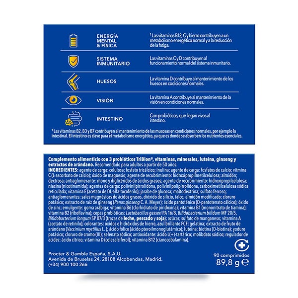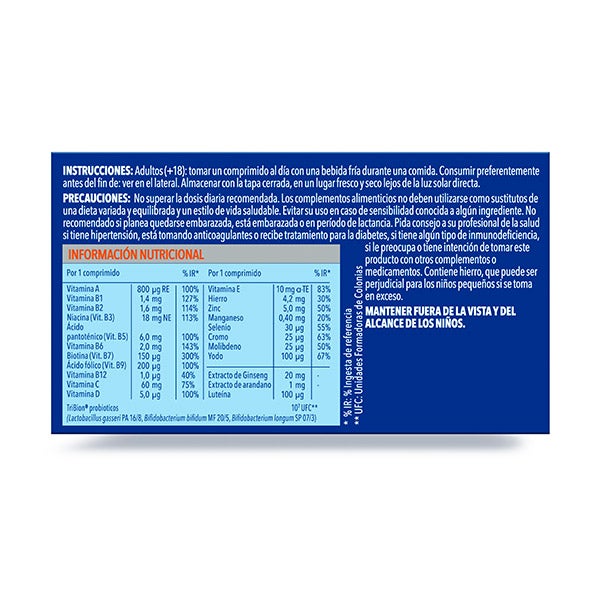Agente De Carga: Celulosa; Fosfato Tricálcico; Inulina; Agente De Carga: Fosfatos De Calcio; Vitmina C (L-Ascorbato De Calcio); Óxido De Magnesio; Agente De Recubrimiento: Hidroxipropilmetilcelulosa; Almidón; Dextrosa; Antiaglomerante: Mono Y Diglicéridos De Ácidos Grasos; Agente De Recubrimiento: Hidroxipropilcelulosa; Niacina (Nicotinamida); Agentes De Carga: Polivinilpirrolidona, Polivinilpolipirrolidona, Carboximetilcelulosa Sódica Reticulada; Vitamina E (Acetato De Dl-Alfa-Tocoferilo); Jarabe De Glucosa; Maltodextrina; Sulfato Ferroso; Antiaglomerantes: Sales Magnésicas De Ácidos Grasos, Dióxido De Silicio, Talco; Almidón Modificado; Cloruro Potásico; Extracto De Raíz De Ginseng (Panax Ginseng C. A. Meyer); Ácido Pantoténico (D-Pantotenato Cálcico); Óxido De Zinc; Emulgente: Goma Arábiga; Vitamina B6 (Clorhidrato De Piridoxina); Vitamina B1 (Mononitrato De Tiamina); Vitamina B2 (Riboflavina); Cepas Probióticas: Lactobacillus Gasseri PA 16/8, Bifidobacterium Bifidum MF 20/5, Bifidobacterium Longum SP 07/3 (Trazas De Leche, Pescado Y Soja); Azúcar; Sulfato De Manganeso; Vitamina A (Acetato De Retinilo); Colorantes: Óxidos E Hidróxidos De Hierro, Azul Brillante FCF; Gelatina; Extracto De Fruto De Arándano (Vaccinium Myrtillus L. ); Ácido Fólico (Ácido Pteroilmonoglutámico); Luteína; Biotina (D-Biotina); Yoduro Potásico; Cloruro De Cromo (III); Selenato Sódico; Antioxidante: Ácido L(+)-Tartárico; Molibdato Sódico; Regulador De Acidez: Ácido Cítrico; Vitamina D (Colecalciferol); Vitamina B12 (Cianocobalamina)