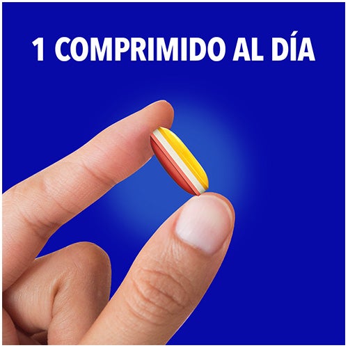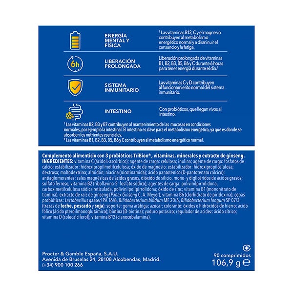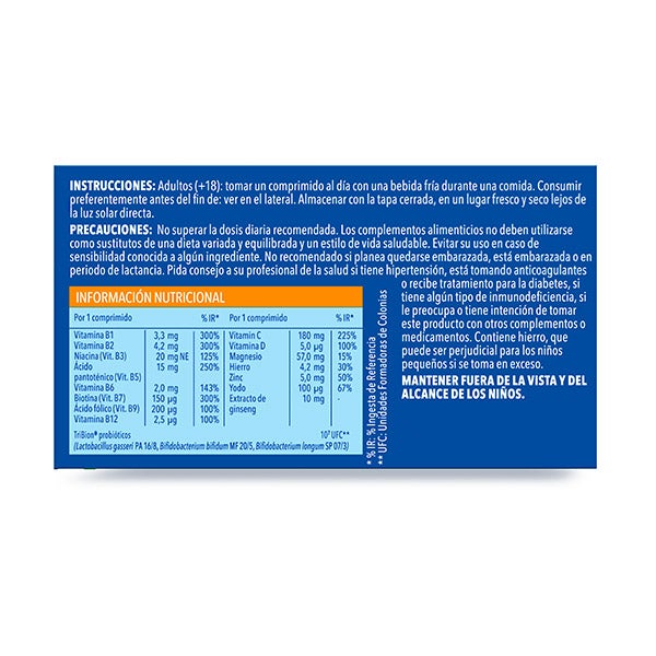 Vitamina C (Ácido L-Ascórbico), Agente De Carga: Celulosa; Inulina, Agente De Carga: Fosfatos De Calcio, Estabilizador: Hidroxipropilmetilcelulosa; Óxido De Magnesio, Estabilizador: Hidroxipropilcelulosa; Dextrosa; Maltodextrina; Almidón; Niacina (Nicotinamida); Ácido Pantoténico (D-Pantotenato Cálcico), Antiaglomerantes: Sales Magnésicas De Ácidos Grasos; Dióxido De Silicio; Mono- Y Diglicéridos De Ácidos Grasos; Sulfato Ferroso; Vitamina B2 (Riboflavina-5'-Fosfato Sódico), Agentes De Carga: Polivinilpirrolidona; Carboximetilcelulosa Sódica Reticulada; Polivinilpolipirrolidona; Óxido De Zinc; Vitamina B1 (Mononitrato De Tiamina); Extracto De Raíz De Ginseng (Panax Ginseng C. A. Meyer); Vitamina B6 (Clorhidrato De Piridoxina), Cepas Probióticas: Lactobacillus Gasseri PA 16/8; Bifidobacterium Bifidum MF 20/5; Bifidobacterium Longum SP 07/3 (Trazas De Leche; Pescado Y Soja), Soporte: Goma Arábiga; Azúcar, Colorante: Óxidos E Hidróxidos De Hierro; Ácido Fólico (Ácido Pteroilmonoglutámico); Biotina (D-Biotina); Yoduro Potásico, Regulador De Acidez: Ácido Cítrico; Vitamina D (Colecalciferol); Vitamina B12 (Cianocobalamina)