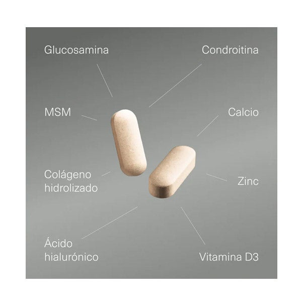 Sulfato de glucosamina, sulfato de condroitina (Pescado), carbonato de calcio, metilsulfonilmetano, agente de carga (celulosa microcristalina), L-leucina, extracto seco de bambú, citrato de zinc, colágeno hidrolizado, Vitamina D3 (colecalciferol), hialuronato sódico.