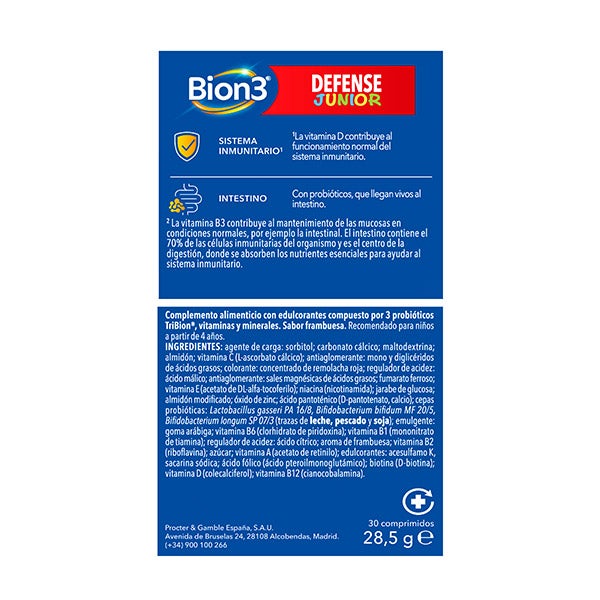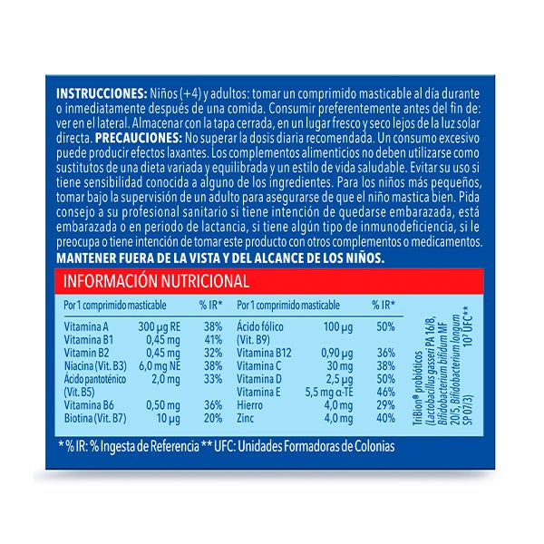 Agente De Carga: Sorbitol; Carbonato Cálcico; Maltodextrina; Almidón; Vitamina C (L-Ascorbato Cálcico), Antiaglomerante: Mono Y Diglicéridos De Ácidos Grasos, Colorante: Concentrado De Remolacha Roja, Regulador De Acidez: Ácido Málico; Antiaglomerante: Sales Magnésicas De Ácidos Grasos; Fumarato Ferroso; Vitamina E (Acetato De DL-Alfa-Tocoferilo); Niacina (Nicotinamida); Jarabe De Glucosa; Almidón Modificado; Óxido De Zinc; Ácido Pantoténico (D-Pantotenato; Calcio), Cepas Probióticas: Lactobacillus Gasseri PA 16/8; Bifidobacterium Bifidum MF 20/5; Bifidobacterium Longum SP 07/3 (Trazas De Leche; Pescado Y Soja), Emulgente: Goma Arábiga; Vitamina B6 (Clorhidrato De Piridoxina); Vitamina B1 (Mononitrato De Tiamina), Regulador De Acidez: Ácido Cítrico; Aroma De Frambuesa; Vitamina B2 (Riboflavina); Azúcar; Vitamina A (Acetato De Retinilo), Edulcorantes: Acesulfamo K; Sacarina Sódica; Ácido Fólico (Ácido Pteroilmonoglutámico); Biotina (D-Biotina); Vitamina D (Colecalciferol); Vitamina B12 (Cianocobalamina)