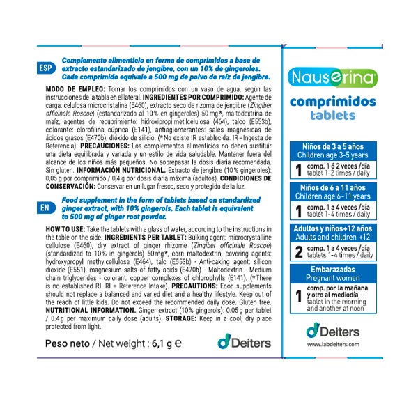 Agente de carga: celulosa microcistalina (E460) extracto seco de rizoma de jengibre (Zingiber officinale Roscoe) (estandarizado al 10% en gingeroles) 50mg* maltodextrina de maíz, agentes de recubrimiento: hidroxipropilmetilcelusosa (464) talco (E553b) colorante: clorofilina cúprica (E141) antiaglomerantes: sales magnésicas de ácidos grasos (E470b) dióxido de silicio. (*No existe IR establecida. IR= Ingesta de Referencia)