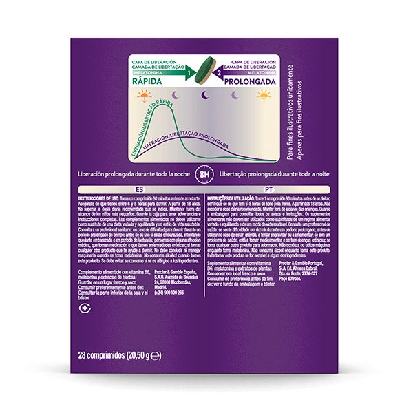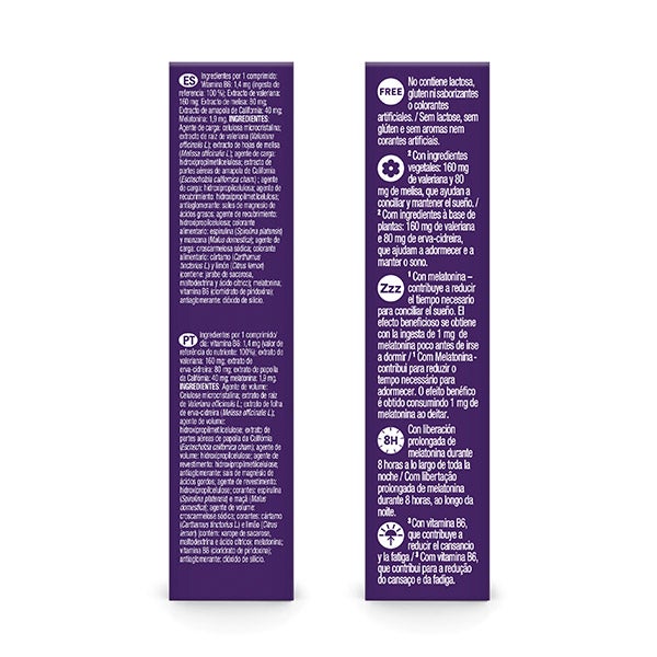 Agente De Carga: Celulosa Microcristalina; Extracto De Raíz De Valeriana (Valeriana Officinalis L.); Extracto De Hojas De Melisa (Melissa Officinalis L.); Agente De Carga: Hidroxipropilmetilcelulosa; Extracto De Partes Aéreas De Amapola De California (Eschscholzia Californica Cham.); Agente De Carga: Hidroxipropilcelulosa; Agente De Recubrimiento: Hidroxipropilmetilcelulosa; Antiaglomerante: Sales De Magnesio De Ácidos Grasos; Agente De Recubrimiento: Hidroxipropilcelulosa; Colorante Alimentario: Espirulina (Spirulina Platensis) Y Manzana (Malus Domestica); Agente De Carga: Croscarmelosa Sódica; Colorante Alimentario: Cártamo (Carthamus Tinctorius L.) Y Limón (Citrus Lemon) (Contiene: Jarabe De Sacarosa, Maltodextrina Y Ácido Cítrico); Melatonina; Vitamina B6 (Clorhidrato De Piridoxina); Antiaglomerante: Dióxido De Silicio. Ingredientes Por 1 Comprimido: Vitamina B6: 1,4 mg (Ingesta De Referencia: 100 %); Extracto De Valeriana: 160 mg; Extracto De Melisa: 80 mg; Extracto De Amapola De California: 40 mg; Melatonina: 1,9 mg