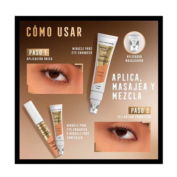 Descubra o Miracle Pure eye enhancer da Max Factor, é antifadiga, iluminador e corretor de cor para olheiras. Com uma base de cuidados com a pele que inclui Cafeína e Vitamina C para olhos mais luminosos.