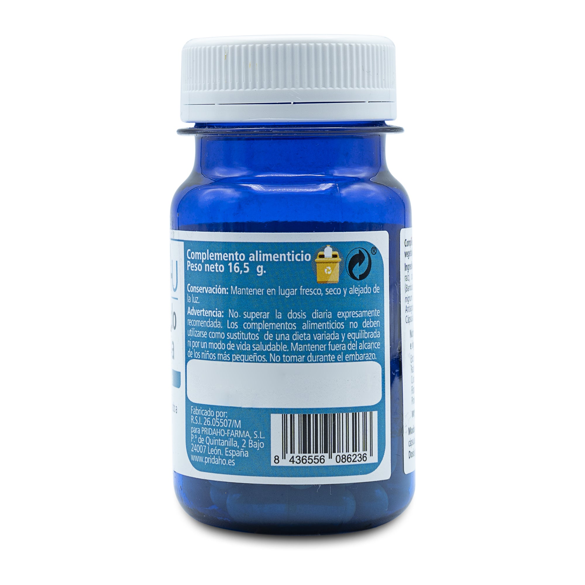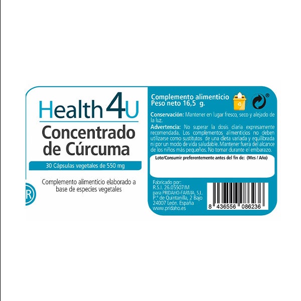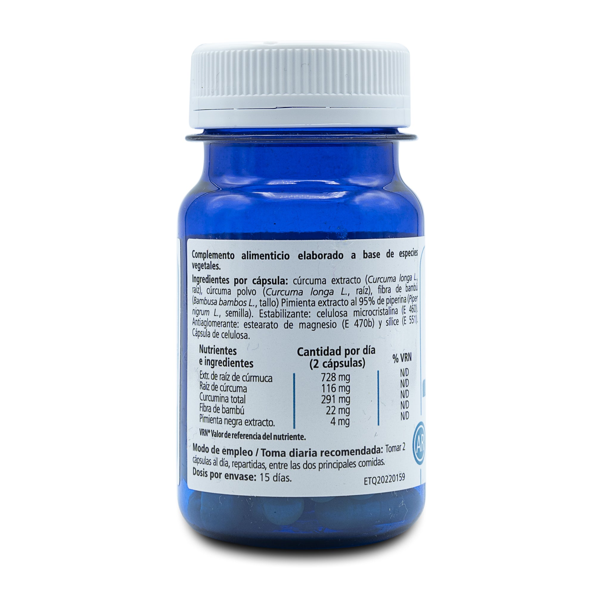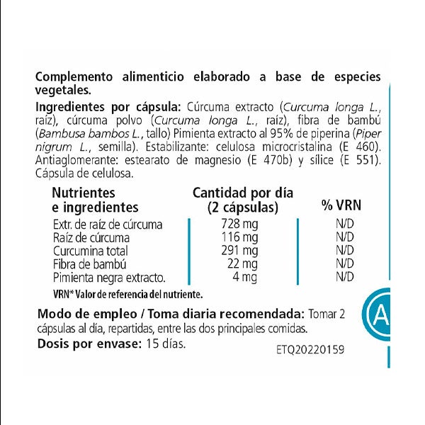 Cúrcuma extracto (Curcuma longa L., raíz), cúrcuma polvo (Curcuma longa L., raíz), fibra de bambú (Bambusa bambos L., tallo) Pimienta extracto al 95% de piperina (Piper nigrum L., semilla). Estabilizante: celulosa microcristalina (E 460). Antiaglomerante: estearato de magnesio (E 470b) y sílice (E 551). Cápsula de celulosa.