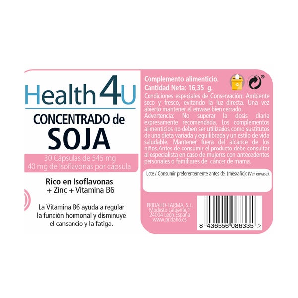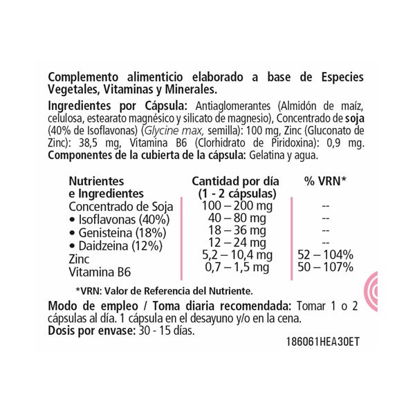 Antiaglomerantes (almidon de maiz, celulosa, estearato magnesico y silicato de magnesio), concentrado de soja (40% de isoflavonas) (glycine max, semilla):100 mg, zinc (gluconato de zinc): 38.5 mg, vitamina B6 (clorhidrato de piridoxina ): 0.9 mg.