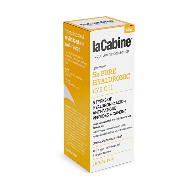 Fórmula em gel com 5 tipos de Ácido Hialurônico, Peptídeos e Cafeína Pura que ajuda instantaneamente a desinchar, hidratar e refrescar o contorno dos olhos, combatendo bolsas e olheiras e alcançando um olhar desperto, energizado e descansado.