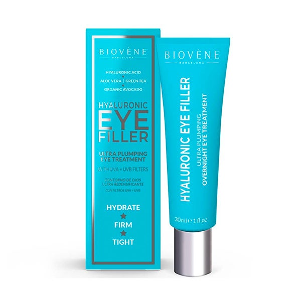 Tratamento contorno de olhos efeito preenchimento EYE FILLER hidrata profundamente a pele abaixo dos olhos durante o dia e a noite com ácido hialurônico e abacate orgânico que ajuda a melhorar a aparência natural da pele, a sensação e a restauração de sua barreira protetora.