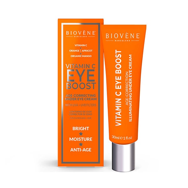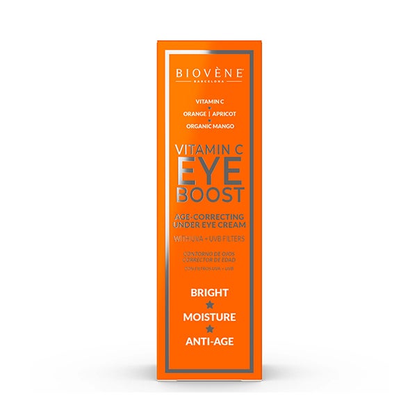 Tratamento contorno de olhos EYE BOOST hidratante de dia e noite corretor de idade para o rejuvenescimento da pele abaixo dos olhos com vitamina C e manga orgânica que ajuda a minimizar a aparição de olheiras, linhas finas e refresca a pele cansada.