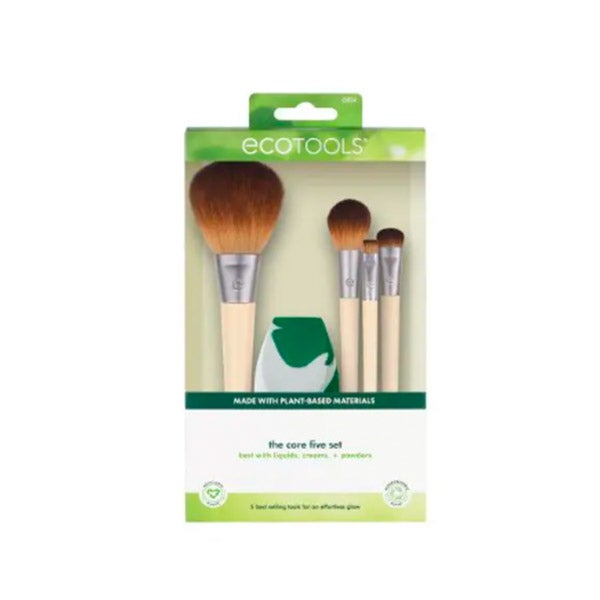 Eco Tools The Core 5 Set e Esponja inclui quatro pincéis de maquiagem essenciais e uma esponja de perfeição.