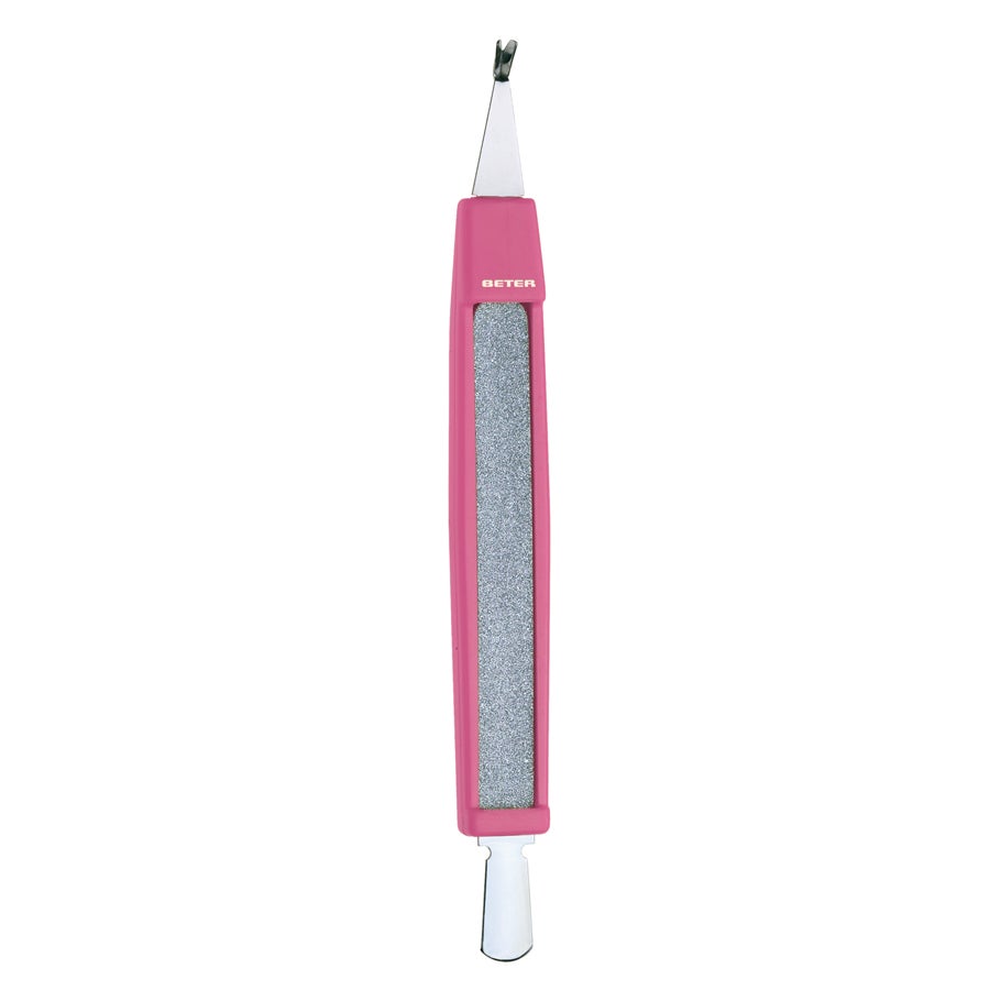 Um Duo muito prático. De um lado remove as cutículas e do outro lixa as unhas.