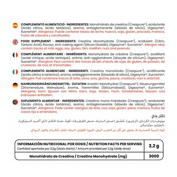 Monohidrato de Creatina (Creapure®), Petazetas, Aromas, Acidulante (Ácido Citrico), Antiaglomerante (Dióxido de Silicio), Sucramix®, Concentrado de Espirulina, Concentrado de Raíz de Remolacha en Polvo (Beta vulgaris L.), Digezyme®.