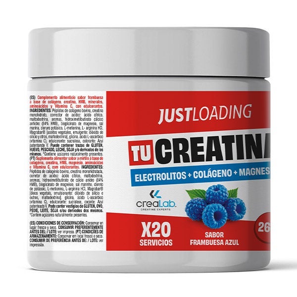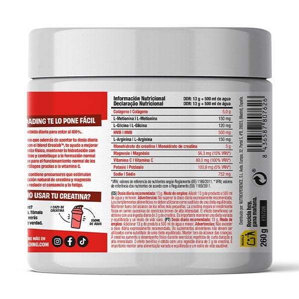 Péptidos de colágeno bovino, Cloruro potásico, Creatina monohidrato, L-metionina, Corrector de acidez: ácido cítrico, L- arginina HCl, Maltodextrina, Magrabar® [aceites vegetales, emulgente: dióxido de silicio y otros, maltodextrina], Aromas, Glicina, Hidroximetilbutirato cálcico anhidro (84% HMB), Ácido L-ascórbico (vitamina C), Bisglicinato de magnesio, Edulcorante: sucralosa, Sal marina, Colorante: Azul patentando V