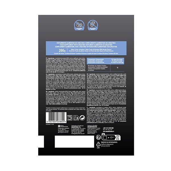 monohidrato de creatina [95%], acidulante (ácido cítrico), aroma, remolacha en polvo (Beta vulgaris, raíz), edulcorante (sucralosa). Puede contener trazas de gluten y sulfitos.