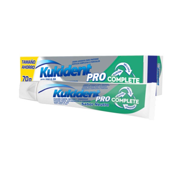Kukident Pro Complete oferece uma fixação firme durante todo o dia e maior conforto graças ao seu efeito de almofada entre as gengivas e a prótese dentária; além disso, ajuda a criar uma barreira que impede que partículas de comida se infiltrem entre as próteses dentárias.