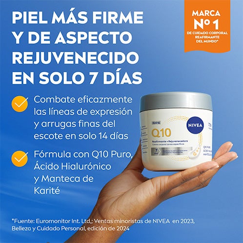 NIVEA Q10 Creme Corporal Reafirmante e Rejuvenescedora para áreas específicas com Q10 puro e Ácido Hialurônico. Em apenas 7 dias: combate eficazmente a perda de firmeza da pele em áreas exigentes do corpo como braços, abdômen, glúteos ou joelhos. Em apenas 14 dias: combate eficazmente as linhas e rugas finas do decote - clinicamente comprovado. Sua fórmula em creme com manteiga de karité proporciona uma hidratação intensa durante 72 horas. Resultados: uma pele mais firme e suave com um brilho natural e um aspecto rejuvenescido. Aplicar nas áreas específicas do corpo com uma suave massagem, até sua completa absorção. Reafirma a pele e proporciona um aspecto rejuvenescido em apenas 7 dias. Hidrata intensamente a pele durante 72 horas. Com Q10 puro, ácido hialurônico e manteiga de karité