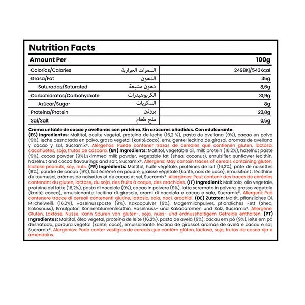 Maltitol, aceite vegetal, proteína de leche (16,2 %), pasta de avellana (9%), cacao en polvo (9%), leche desnatada en polvo, grasa vegetal (karité,coco), emulgente: lecitina de girasol, aromas de avellana y cacao y sal, Sucramix®.