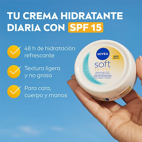 NIVEA Soft Creme Hidratante Multiuso UV diário SPF15 100ml é um creme hidratante refrescante e suave que combina a hidratação diária com uma proteção UV para uma pele saudável e luminosa.