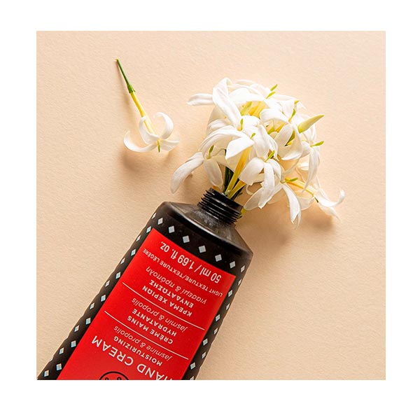 Creme hidratante que mantém a hidratação natural das mãos e unhas enquanto deixa a pele suave e com leves toques de aroma a jasmim.